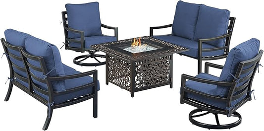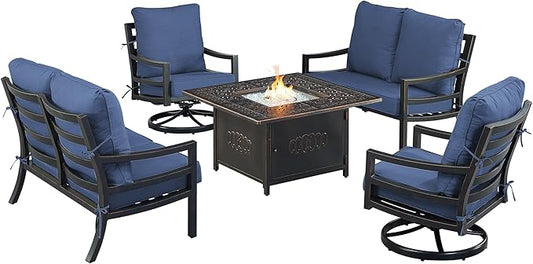 Oakland Living Black Aluminum Patio Fire Table Set with Two Deep Seating Loveseat with Cushions and Two Club Chairs with Blue Cushions