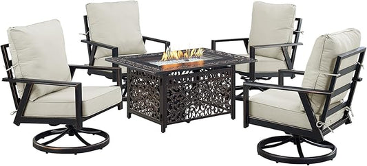 Oakland Living Black Aluminum Patio Fire Table Set with Two Deep Seating Loveseat with Cushions and Two Club Chairs with Light Grey Cushions