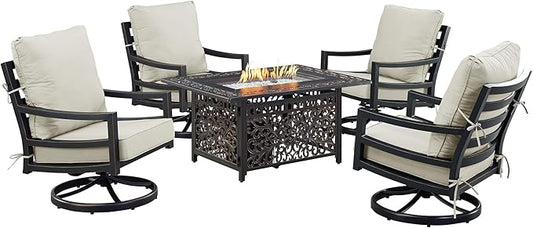 Oakland Living Black Aluminum Patio Fire Table Set with Four Club Chairs with Light Grey Cushions