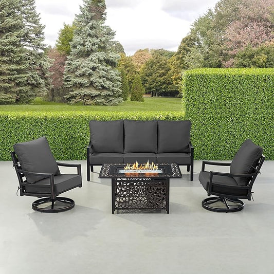 Oakland Living Black Aluminum Patio Fire Table Set with Deep Seating Sofa with Cushions and Two Club Chairs with Black Cushions