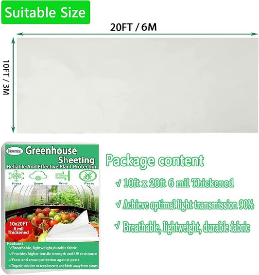 10FTx20FT Greenhouse Plastic Sheeting, 6 Mil Thick Clear Polyethylene Film, Waterproof Wind Frost Dust UV Resistant Green House Plastic Covering for Outdoor Plant, Garden, (10ft x 20ft)