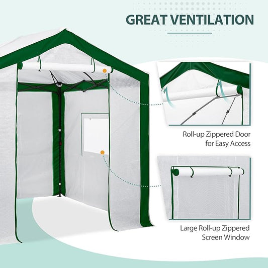 EAGLE PEAK Replacement Cover for 8x6 Portable Pop up Greenhouse with Polyester Reinforced Corners, Front Roll-Up Zipper Entry Door and 3 Large Roll-Up Side Windows (Frame Not Included), Green/White