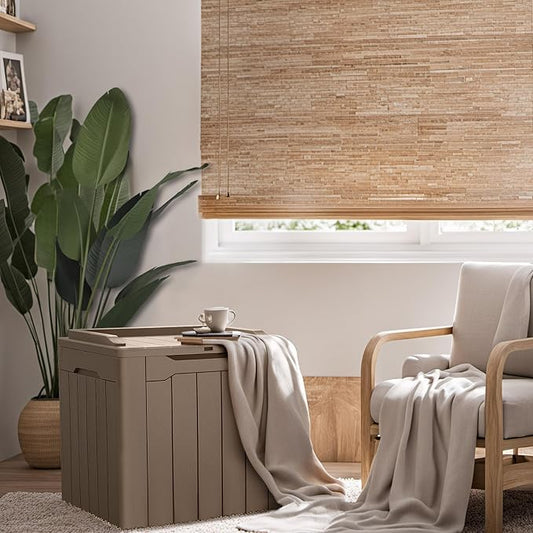 Greesum 100 Gallon Resin Patio Storage Box for Garden Tools, Outdoor Furniture Cushions, Pool Supplies, Light Brown