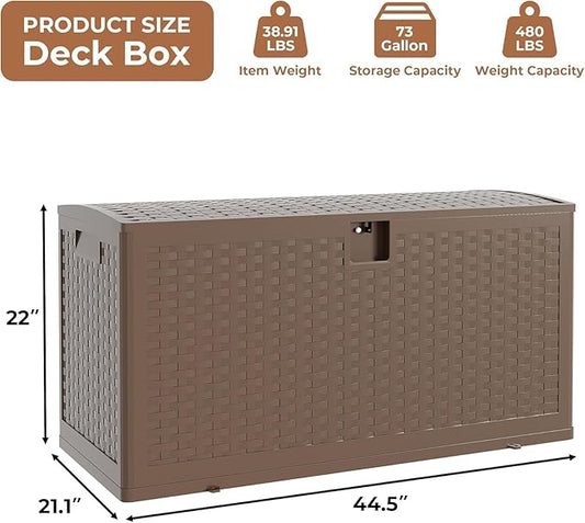 73-gallon outdoor waterproof storage box Lockable outdoor storage box Resin box for parcel delivery Suitable for storing balcony furniture, garden tools, toys - Brown wood grain finish