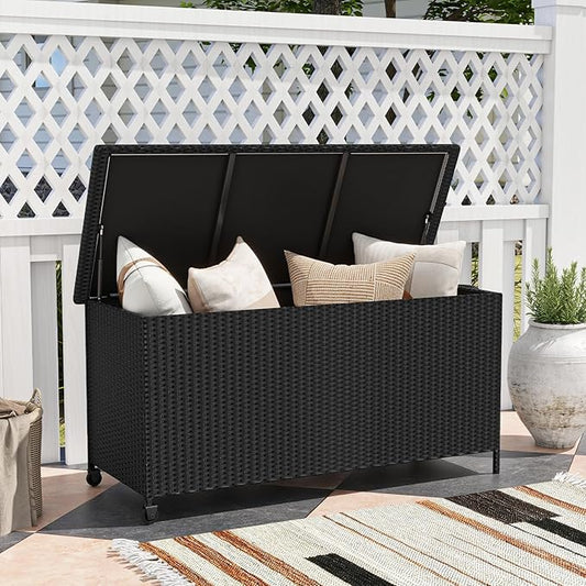 Tangkula Rattan Deck Box, 85 Gallon Storage Container with Waterproof Liner, Wheels & Gas Strut, Indoor Outdoor Wicker Storage Cabinet, Storage Furniture for Pillows, Cushions (Black)