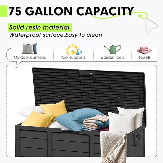 75 Gallon Outdoor Deck Box - Durable Resin Storage with Lockable Lid, for Patio Furniture Cushions, Pillows (Black)