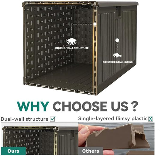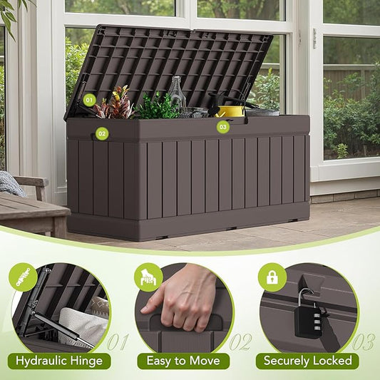 Devoko 78 Gallon Deck Box, Waterproof Resin Outdoor Storage Box for Outside and Patio, Outdoor Storage Bench Lockable for Patio Furniture, Garden Tools and Pool Supplies (Brown, 78 Gallon)