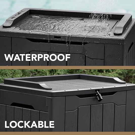 35 Gallon Outdoor Storage Box, Waterproof Resin Deck Box with Lockable Lid, Patio Furniture Side Table & Storage Bin for Package Delivery, Patio Cushions, Garden Tools, Pool Accessories, Black