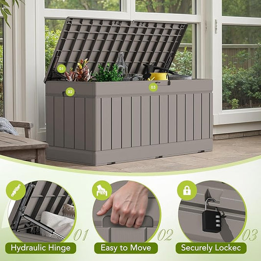100 Gallon Resin Outdoor Storage Box,Waterproof Deck Box Lockable for Patio Furniture Cushions, Garden Tools, Heavy-Duty Double-Wall Structure with Gas Lift and Reinforced Seat Lid, Grey