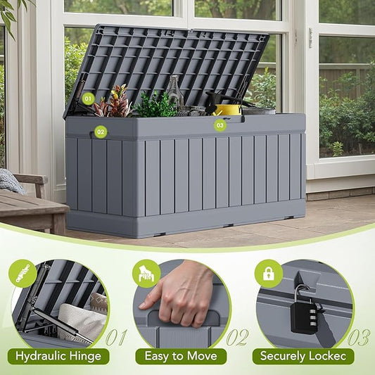100 Gallon Deck Box Lockable Resin Outdoor Storage Box waterproof Outdoor Container for Patio Furniture Cushions, Pillow