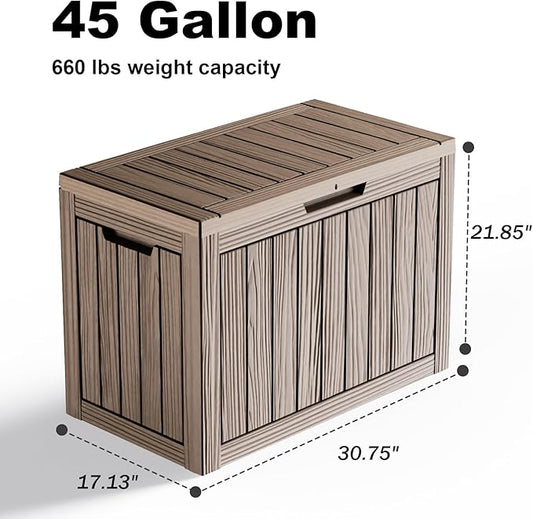 45 Gallon Deck Box, Resin Outdoor Indoor Waterproof Storage Box, Lockable Storage Box With Handle for Patio Furniture - Garden Tools - Swimming Pool Tools UV-Resistant, Brown