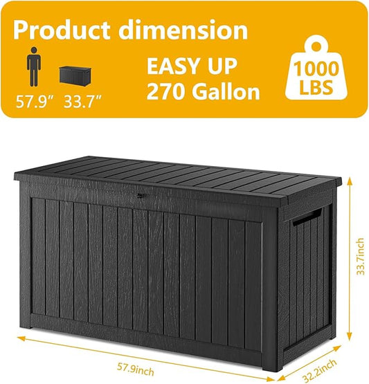 270 Gallon Deck Box, Resin Outdoor Indoor Waterproof Storage Box, Lockable Storage Box With Handle for Patio Furniture - Garden Tools - Swimming Pool Tools UV-Resistant - Black