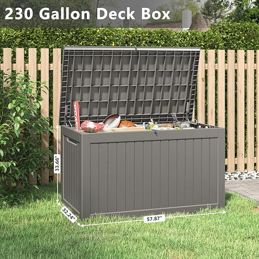 KAMABOKO 230 Gallon Outdoor Storage Box, Resin Deck Boxes Indoor and outdoor, Waterproof Storage Box Lockable Lid for Garden Tools, Package Delivery, Patio Cushions, Grey