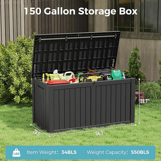KAMABOKO Outdoor Storage Box, 150 Gallon Large Outdoor Resin Deck Box, Storage Waterproof Boxes Lockable Lid for Garden Tools, Pool Supplies, Patio Furniture and Cushions, Black
