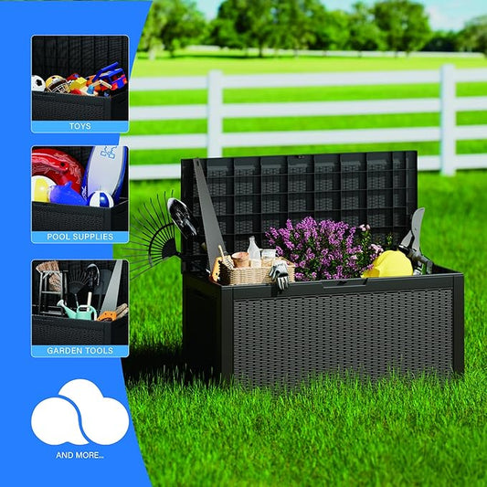 100GAL Black Wicker - Textured Outdoor Deck Box with Lock - Waterproof, SGS - Approved UV Resistance, Stylish Storage Solution for Patio Furniture and Outdoor Toys, Quick Assembly