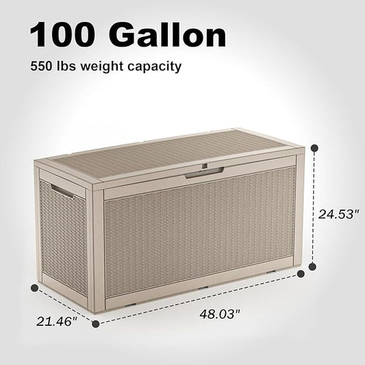 100 Gallon Outdoor Storage Box - Deck Box Waterproof Patio Furniture, Garden Tools, Cushions, Pool Accessories Outside Storage Resin Box