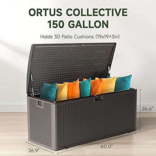 150 Gallon Deck Box, Double Layer Waterproof Resin Outdoor Indoor Storage Box, Lockable & UV Resistant Storage Bin for Patio Furniture, Garden Tools, Pool Accessories (Brown)