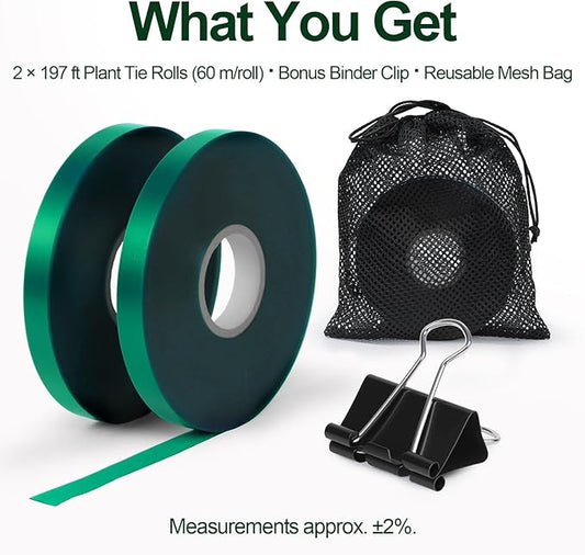 2 Rolls Plant Tie Tape, 0.5 in × 197 ft Each (394 ft Total) – Soft Stretch PVC Garden Ties, Reusable Non-Adhesive, with Binder Clip & Mesh Storage Bag for Tomato, Vine, Flower & Tree Suppor