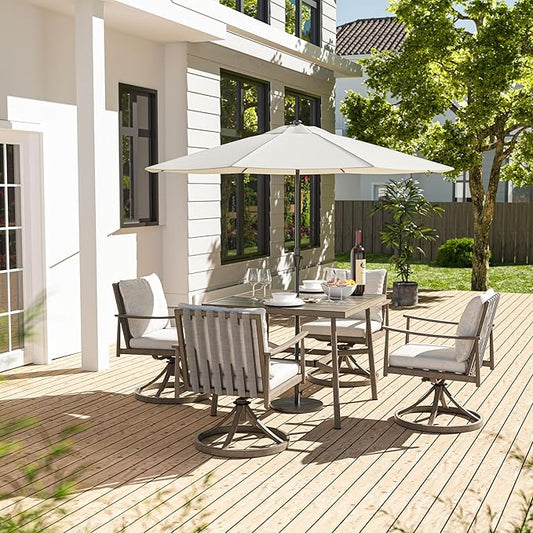 HAPPATIO 5-Piece Outdoor Dining Set for 4, Aluminum Patio Dining Set Includes 1 Large Square Table with Umbrella Hole & 4 Swivel Dining Chairs, Patio Furniture Set for Lawn, Porch, Backyard (Grey)