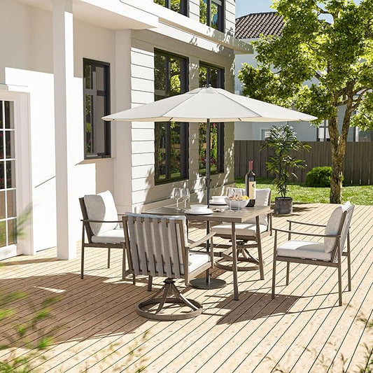 HAPPATIO 5-Piece Outdoor Dining Set for 4, Aluminum Patio Dining Set Includes 1 Large Square Table with Umbrella Hole, 2 Swivel Dining Chairs, and 2 Dining Chairs, for Lawn, Porch, Backyard (Brown)