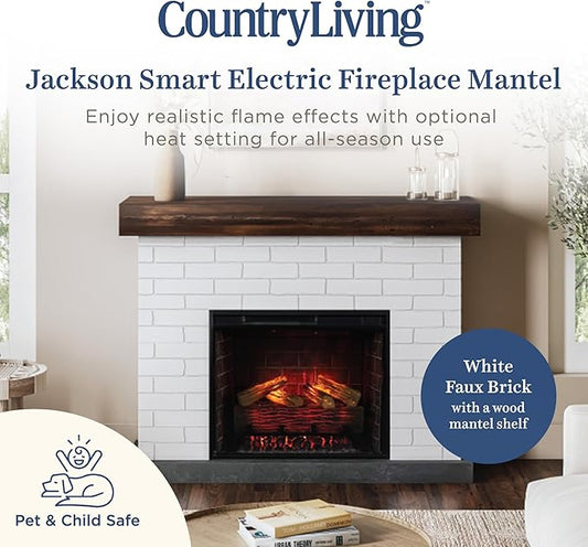 Country Living - Jackson Fireplace Mantel Package, WiFi Enabled 28” Fireplace Insert, White Brick Mantel Surround, Alexa/WiFi Enabled, 1500W