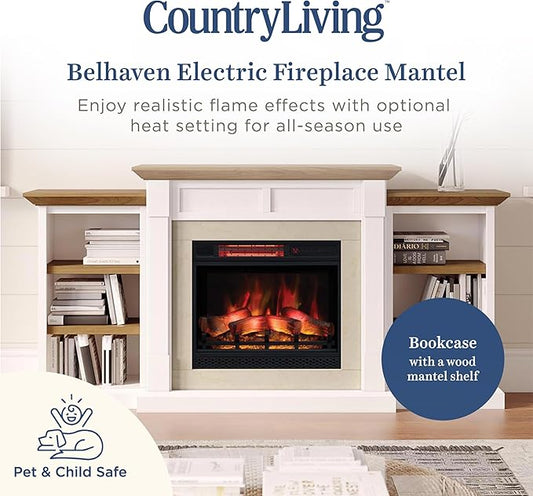 Country Living Belhaven 74 Inch Bookcase Mantel Package | 23 Inch Electric Fireplace Insert Heater with Remote | Warm Walnut Shelving | Marble or White Trim | Multi-Color Flames