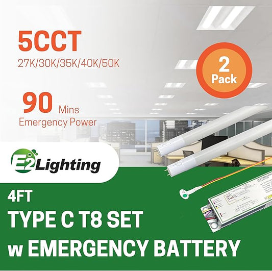LED Type C T8 Tube Light Kit with Emergency Battery Driver, 2 Tube&1 Driver, 90 Min Backup Power Replacement for T12/T5/T8 Troffer/Strip Fixtures-2 Pack
