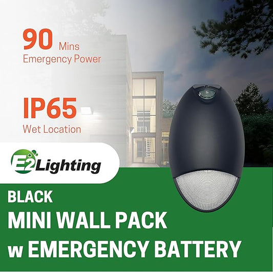 Mini Wall Pack Outdoor Emergency Lights, P65, Battery Backup 90mins Power, Photocell Sensor, Wet Resistant, LED Emergency Backup Lighting for Business and Home (Black)
