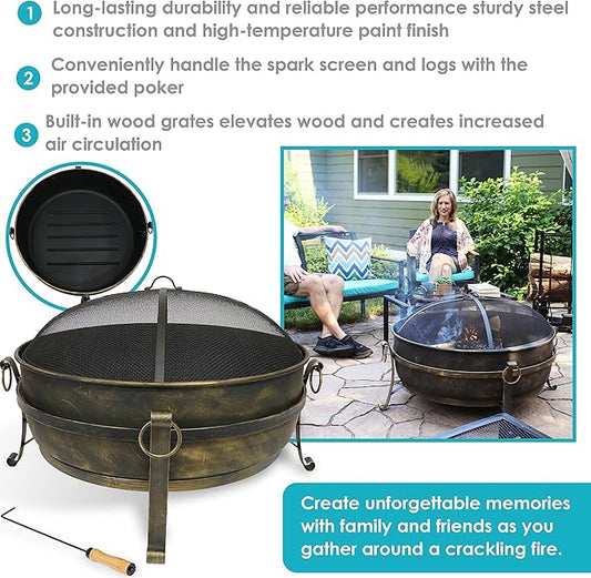 Sunnydaze 34-Inch Large Fire Pit for Outside - Wood-Burning Fire Pit Bowl for Outdoors with Spark Screen, Log Poker, and Grate