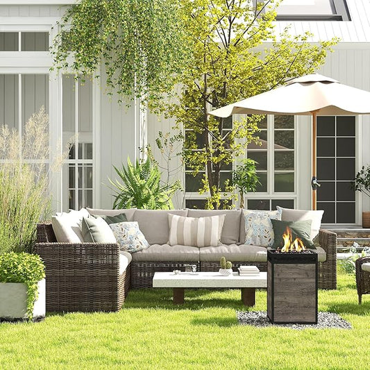 Brown Fire Pit Table with Tiled Top, Beads, and Covers – Propane Backyard Fireplace and Patio Furniture with Hidden Tank Storage