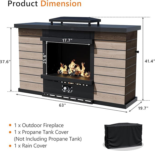 Outdoor Propane Fireplace, 50,000 BTU Gas Fire Pit with Ceramic Logs, Rain Cover, 63 Inch Steel Metal Smokeless Fireplace for Patio, Deck, CSA Certified (63 x 41 Inch)