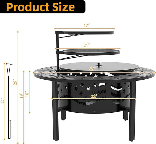 PrimeZone 42" Outdoor Fire Pit with 2 Grills - Wood Burning Firepit for Outside with Cover & Poker, Heavy Duty Metal Fire Pit Large Round Fireplace for Patio, Backyard, Picnic, Camping, Bonfire