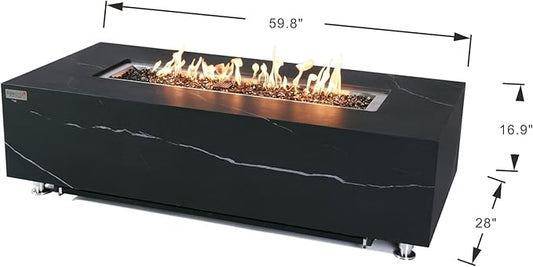Elementi+ | Bundle Varna Gas Fire Pit | Marble Porcelain & Metal Frame | 60" Rectangular Fire Table | Electronic Ignition | Canvas Cover, Fire Glass & Burner Lid Included | Black | Natural Gas