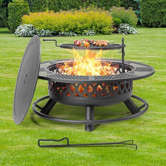 42 Inch BBQ Fire Pit with 2 Grills,3-in-1 Outdoor Round Metal Fire Pit Table with Lid,Fire Poker,Large Outdoor Wood Burning Firepits for Outside,Picnic,Bonfire Backyard Patio(Black)