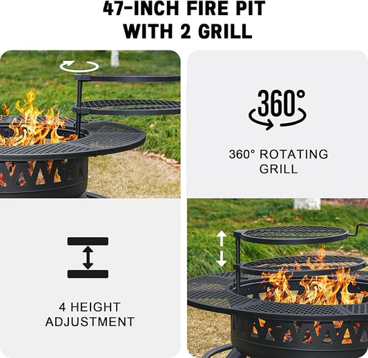 47 Inch Fire Pit with 2 Grills, Outdoor Extra Large Firepits for Outside, Wood Burning Fireplace for Camping,Picnic,Bonfire, 3-in-1 Round Metal Table with Lid for Backyard,Patio,Party