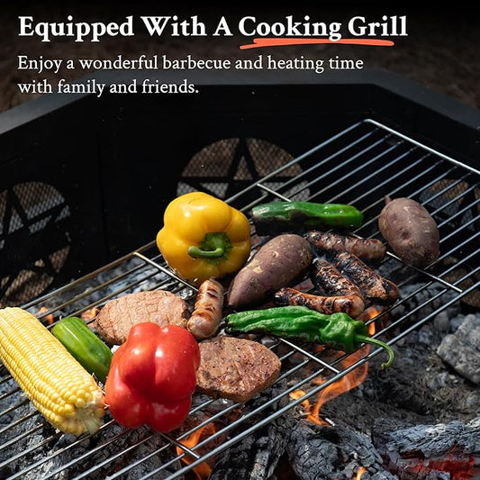 43 Inch Octagonal Fire Pit with Cooking Grill,Outdoor Wood Burning Fire Pit for Camping Outside Picnic Bonfire,Heavy Duty Firepit for Backyard Garden Patio