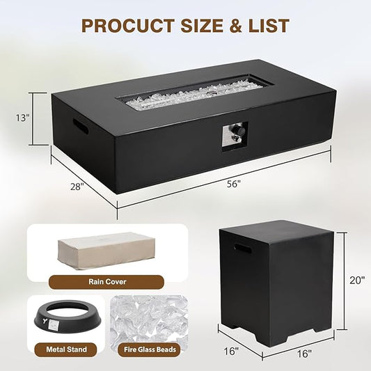 NAGA HABNA 56 Inch Propane Fire Pit Table, Rectangle Outdoor Fire Table w Tank Table (50,000 BTU), 3 Piece Gas Fire Pit w Glass Wind Guard & Lava Rocks for Garden, Pool, Backyard