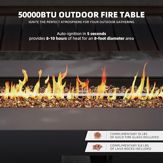 NAGA HABNA 56 Inch Propane Fire Pit Table, Rectangle Outdoor Fire Table w Glass Wind Guard (50,000 BTU), 2 Piece Gas Fire Pit w Lava Rocks for Garden, Pool, Backyard