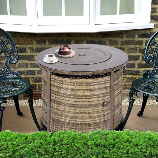 32 inch Propane Fire Pit Table,Wicker Gas Fire Pits Table with Lid & Lava Rocks, 50000 BTU Round Propane Firepit for Outside, Fire Table for Dining,Party, Patio,Yard