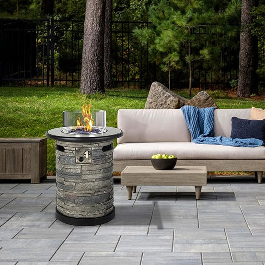 Outdoor Propane Fire Pit Table, Round Porcelain Tile Top 22" Fire Bowl Column W/ 40,000 BTU Firepit Table Auto-Ignition 400D Cover Glass Rocks for Outside Patio