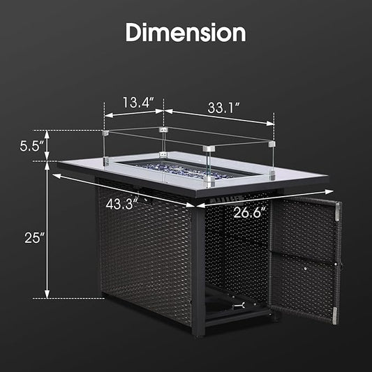 43'' Gas Fire Pit Table, Outdoor Rectangle Fire Pit Table with Cover, Glass Wind Guard & Glass Rock, 60000 BTU Stainless Steel H-Burner Fire Pit Tables for Outside Patio Backyard Garden (Rectangle)