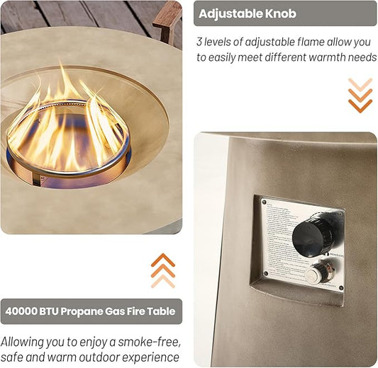 SUNBURY 42Inch Outdoor Propane Fire Pit,CSA Certified,Round Dark Brown Patio Fire Table Concrete Burner Firepits 50,000 BTU w Lava Rocks, Glass Wind Guard, Waterproof Cover