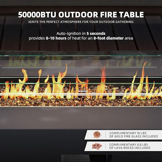 UPHA 42-inch Outdoor Propane Gas Fire Pit Table 50000 BTU Iron Rectangle Firepit for Outside Patio with Tank Hidden Table, Wind Guard, Removable Lid, Gold Glass Rocks, Rain Cover, Dark Grey