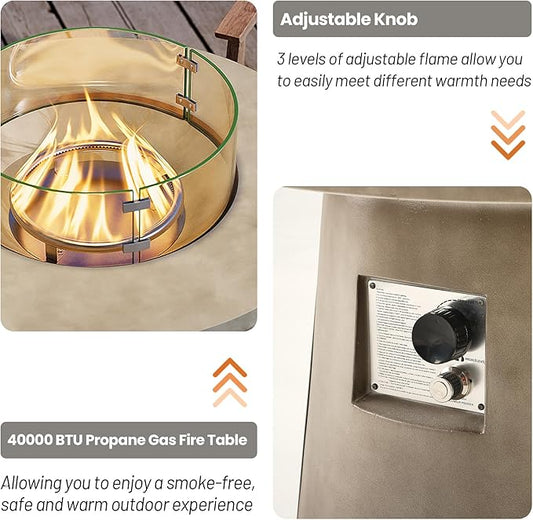 Outdoor Cylinder Propane Fire Pit Table – Premium Terrazzo-Like MgO Finish, Sturdy & Waterproof Gas Fire Table with Glass Wind Guard for Patio, Garden & Backyard, Includes Rain Cover & Glass Bead