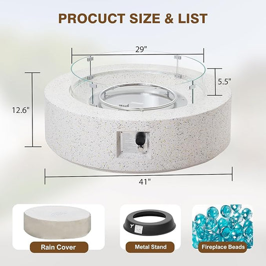 2-Piece Outdoor Propane Fire Pit Table Set – Premium Terrazzo-Like MgO Finish, Round Gas Fire Table with Glass Wind Guard for Patio, Garden & Backyard, Includes Rain Cover & Glass Beads