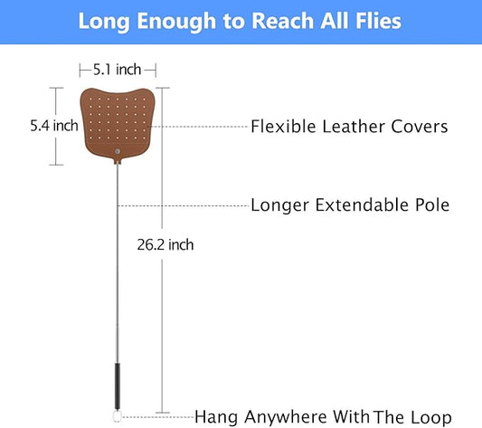 Foxany Telescopic Fly Swatters Heavy Duty Set, Leather Fly Swatter with Extendable Long Handle, Flexible Manual Flyswatter for Indoor Outdoor, 2 Pack