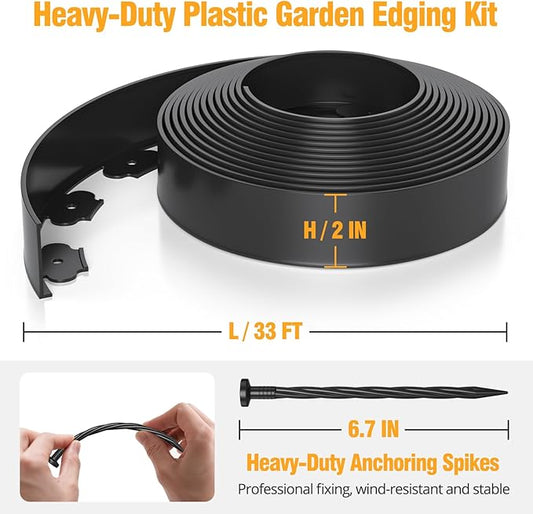 33FT No-Dig Landscape Edging, Heavy Duty 2 Inch Tall Plastic Garden Border with 30 Anchoring Spikes (Black)