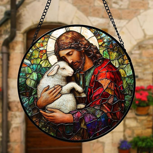 Stained Glass Window Hanging, Jesus Little Lamb Sun Catchers Colorful Glass Panel Christianity Suncatcher Decor for Birthday for Women, Men, Wife, Aunt, and Mom 11.8x11.8 in