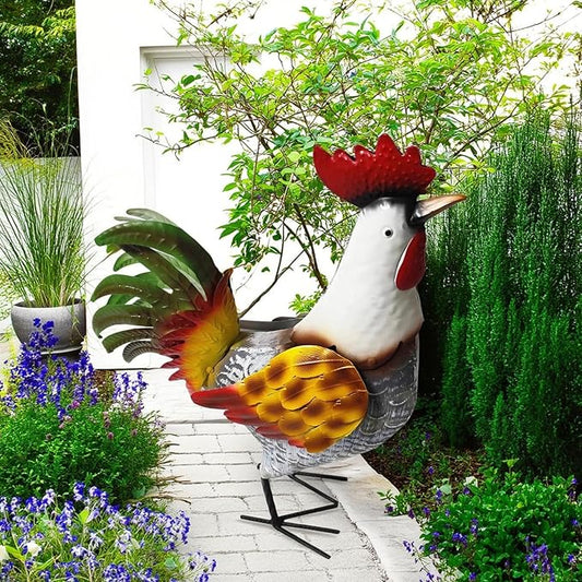 Metal Rooster Statue, Garden Outdoor Decor, Red and Gold Feathers, Weather Resistant, Metal Chicken Yard Art Sculpture, Iron Garden Animal Statue