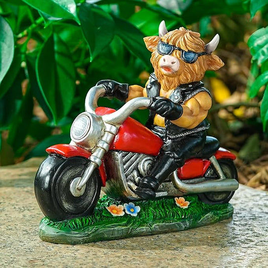 Decorative Highland Cow on Motorcycle Statue with LED Headlight - Rustic Outdoor Garden Ornament, Biker Cow Figurine for Yard, Patio, or Home Decor Gifts